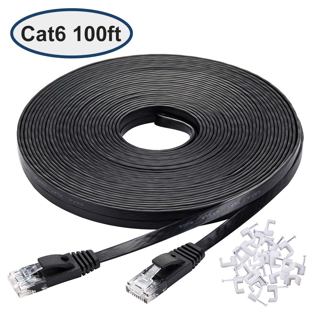 Cat 6 Ethernet Cable 100 Ft Black Flat Cable With Clips High Speed Internet Network Cable Faster Than Cat5e Cat5