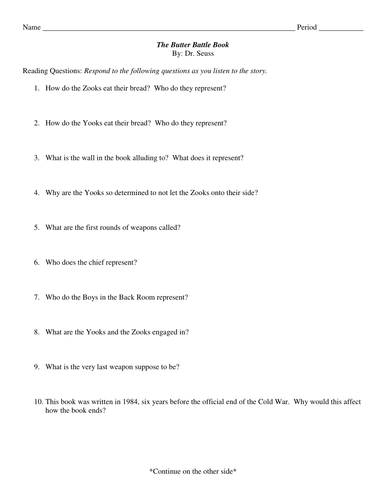Briliant Lesson Plan Butter Battle Book Quiz Worksheet
