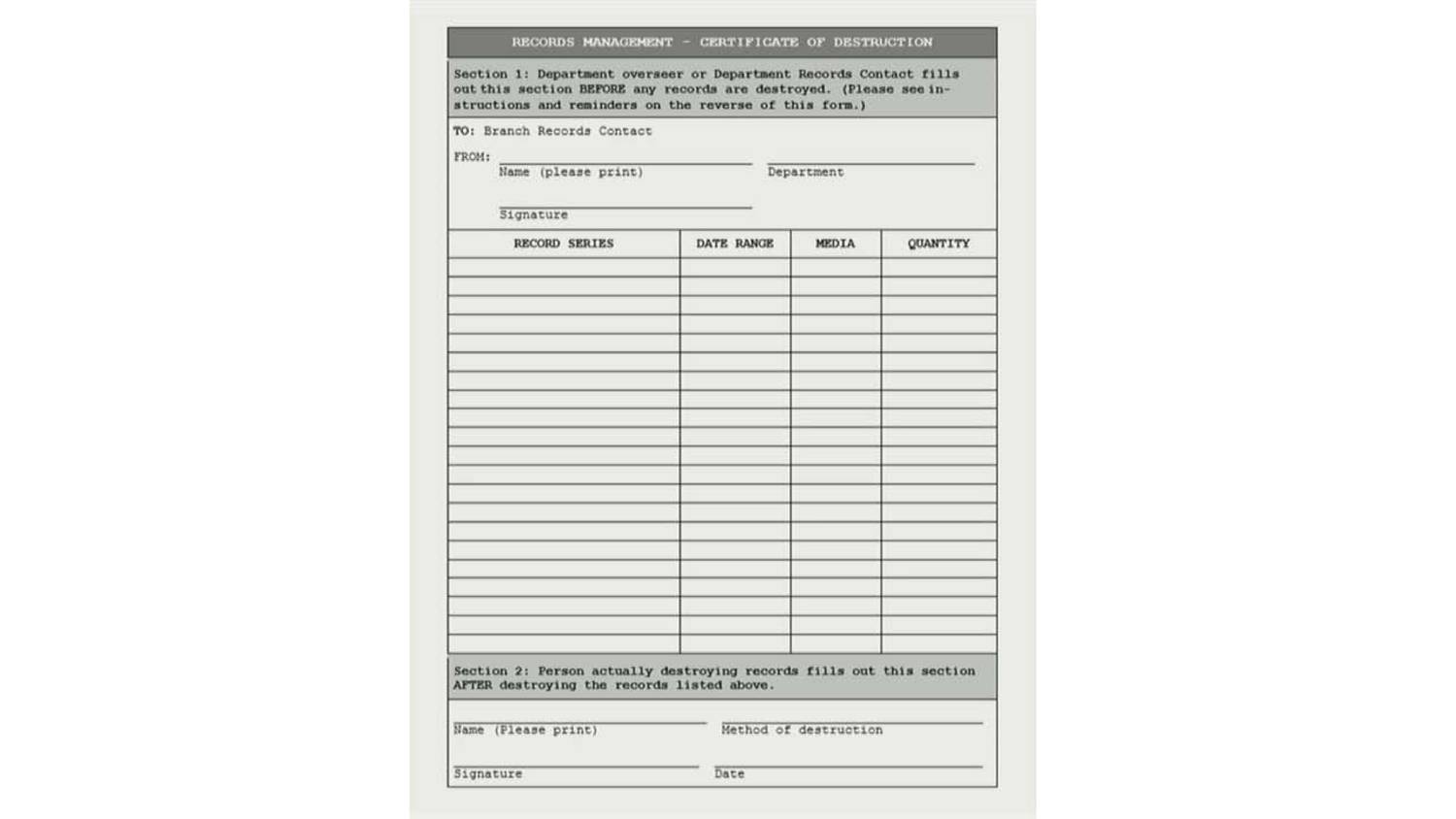 The property owner can apply for this certificate once their insurance agency considers that the property is no longer fit for continued use. Sample certificate of destruction facility name the information described below was destroyed in the normal course of business pursuant to a proper retention schedule and destruction policies and procedures. A unique serialized transaction number that you can use in an audit trail. A certificate of destruction also referred to as a salvage certificate of title is a title given to owners whose property or properties have been destroyed due to accidental reasons.