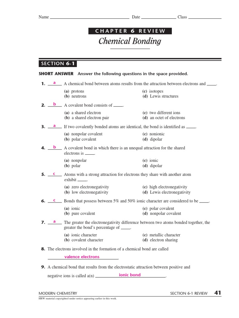 Chemical Bonding Review Worksheet Answer Key