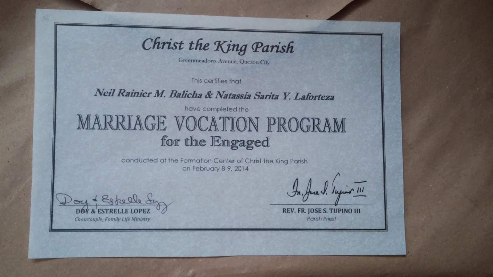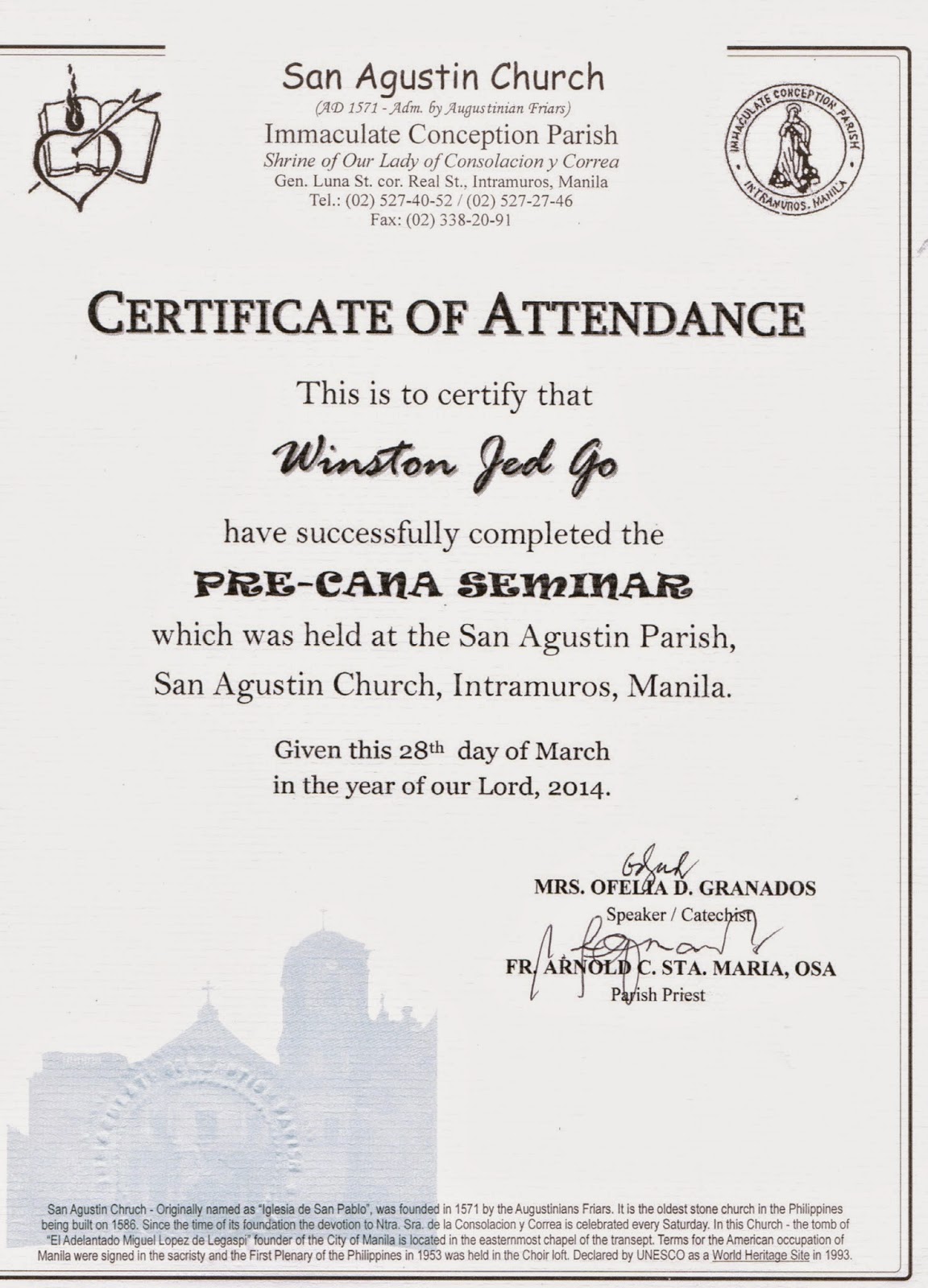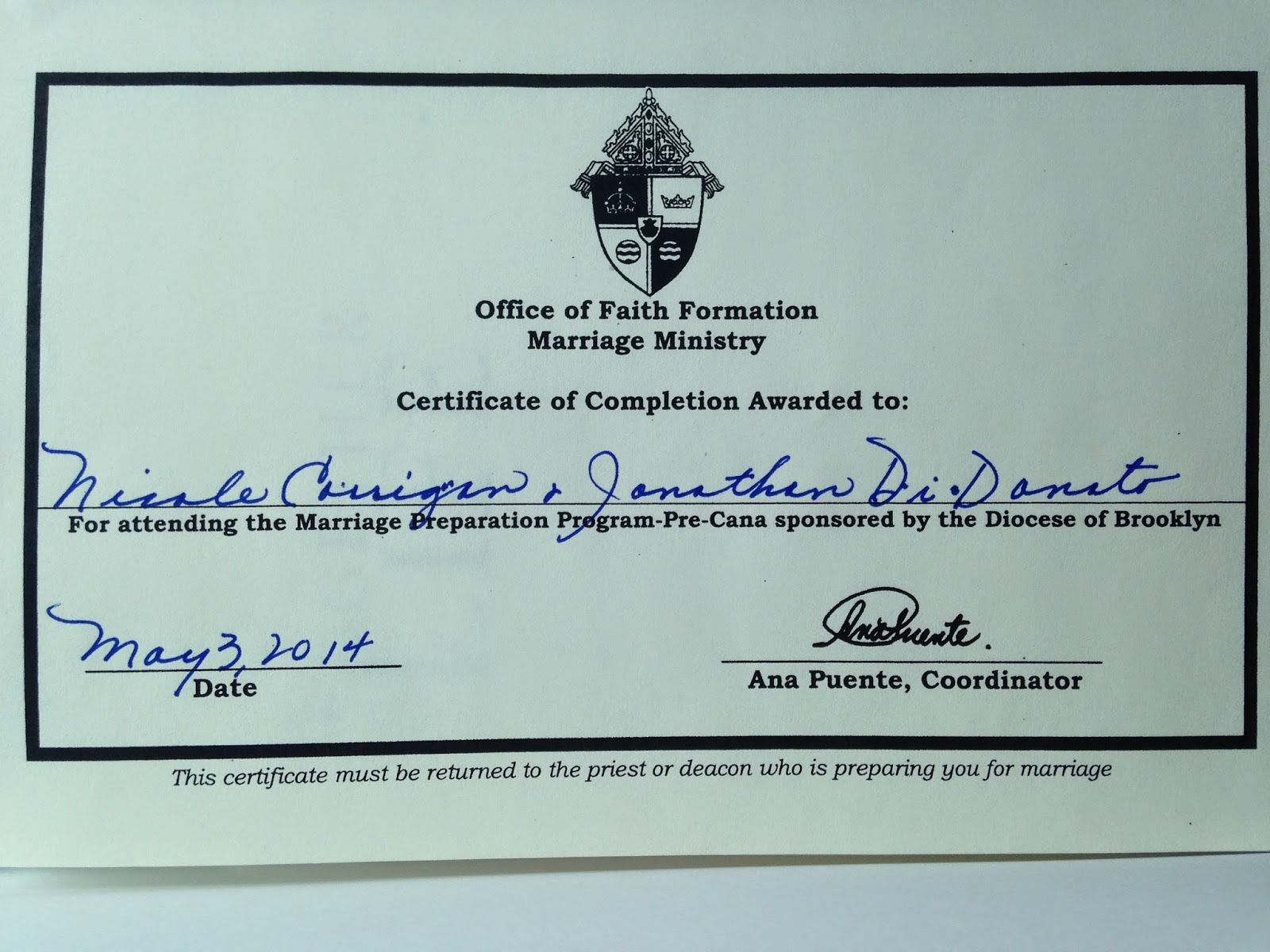 Pre cana certificate. Receive a certificate of completion as soon as youre done. Pre cana is a one day saturday. When its all said and done you get a certificate for the completion of a pre cana class. Please enter your names exactly how you want them to read on your certificate.
