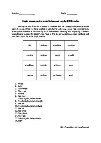 Magic Square On Spanish Preterite Tense Conjugation Of Regular Er Ir Verbs Fun Worksheet No Prep