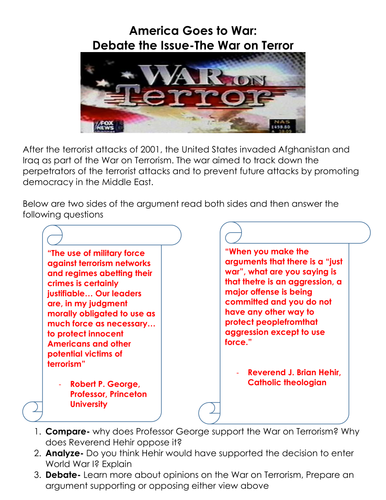 America Goes To War Debate The Issue The War On Terror Worksheet And Discussion Mini Lesson