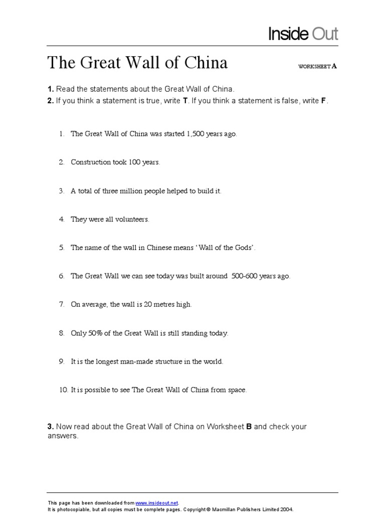The great wall of china worksheets. Now read about the great wall of china on worksheet b and check your answers. Looking for more great sites. You need to use this workbook in your classroom.